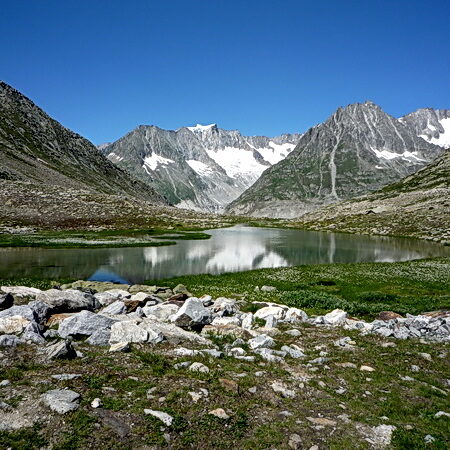 Auch im Sommer ist die Alpen Lodge ein tolles Urlaubsziel. Wandern am Alteschgletscher oder zum Lüsgersee.